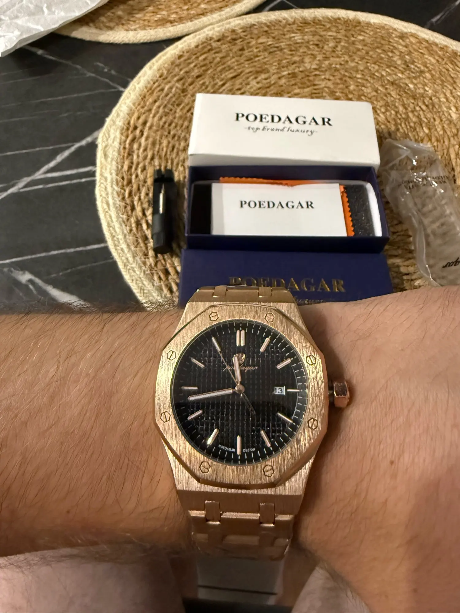The POEDAGAR LumeMaster combines modern elegance with practical functionality. Built with a stainless-steel case and band, luminous hands, and water resistance up to 3 Bar, it’s a timepiece designed for both casual wear and everyday reliability. With auto date and quartz precision, this watch blends style with performance, making it a versatile accessory for any occasion.